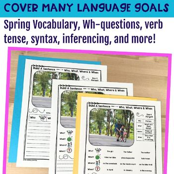 As students create sentences based on the spring photos, you can naturally target morphology, syntax, and sentence comprehension within context. The real pictures also support background knowledge and inference skills.