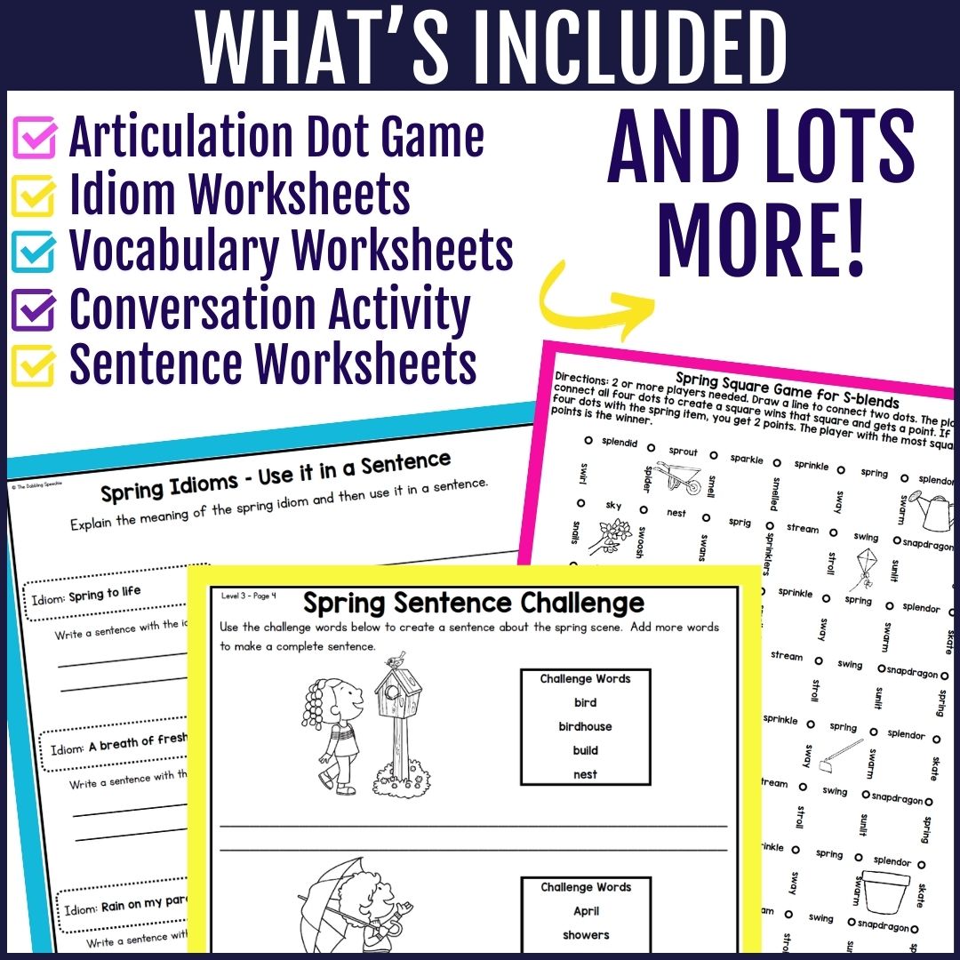 You’ll also find leveled language worksheets for complex sentences, describing spring items, idioms, articulation practice, word associations, and more!