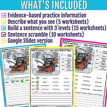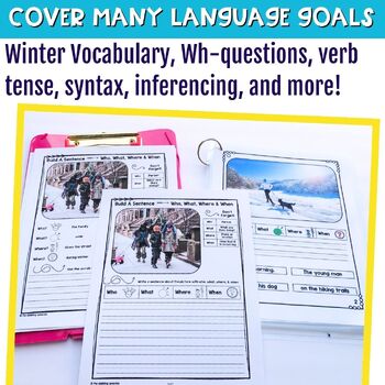 The perfect winter grammar worksheets for your speech and language groups. These winter edition Build a Sentence Worksheets are designed for reviewing and formulating sentences with speech therapy students. These activities cover various language skills, including early syntax, grammar, and question formulation. A great way to incorporate winter vocabulary with real winter photos.